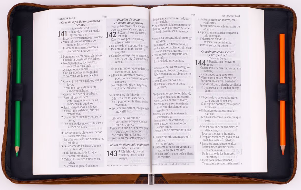 Esta llamativa funda está construida de un cuero duradero que se ve y se siente como cuero real. Tiene un tirador de cremallera grabado con una cruz y una manija especial en el lomo para que su Biblia pueda abrirse en forma plana. También provee dos lazos para bolígrafos en la parte interior.
