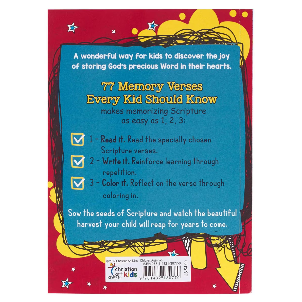 Boys and girls aged 5-8 will enjoy memorizing 77 of the Bible's key Scripture verses in this fun and engaging format. 77 Memory Verses Every Kid Should Know makes memorizing Scripture as easy as 1 - READ it, 2- WRITE it, and 3 - COLOR it!