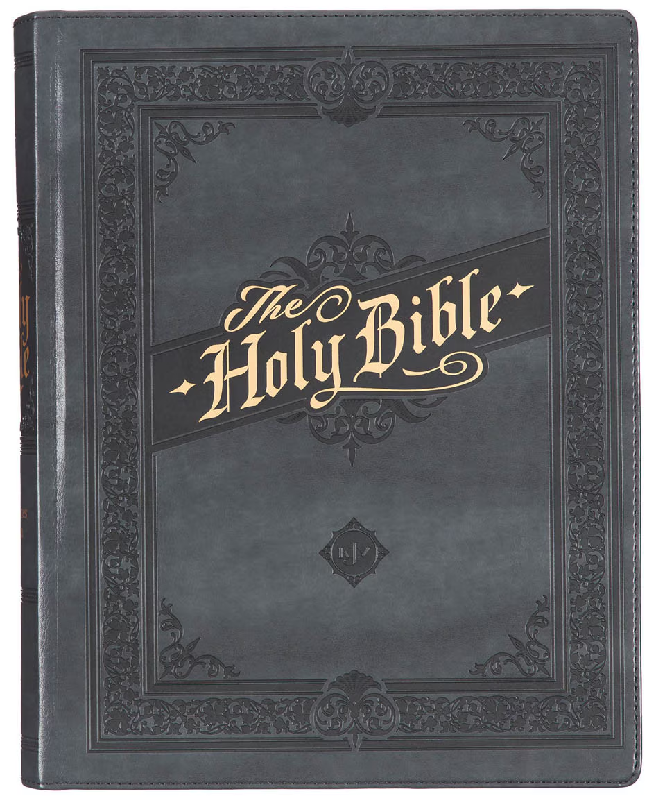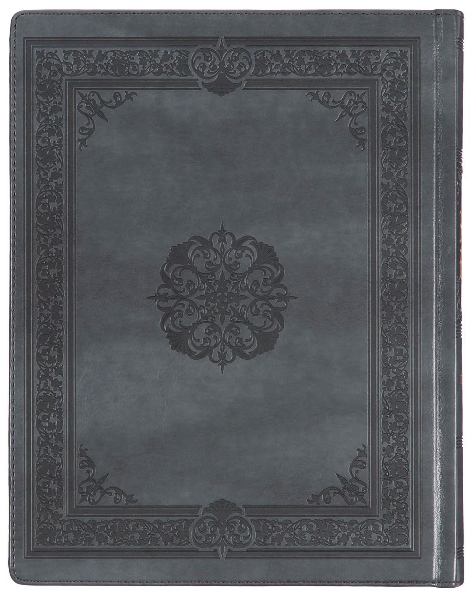 The hardcover Bible is wrapped in iron gray faux leather that is adorned with intricate details and elegant embellishments. The front and back cover features an exquisite heat-debossed interlinked ivy-patterned frame, complemented by delicate corner scroll designs that accentuate the overall design. The title, adorned with gold foil, is displayed on a smooth banner that is superimposed on an elaborate heat-debossed emblem.