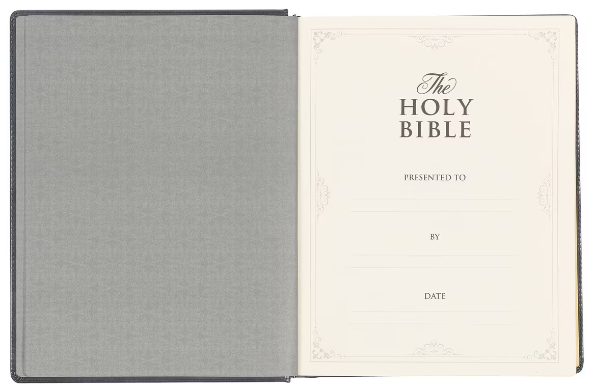 Mark a notable achievement or milestone with the perfect gift - the Iron Gray Faux Leather Hardcover Large Print King James Version Note-taking Bible. This exquisite Bible is not only a cherished possession but also an opportunity to document and reflect on the faith journey of your friend, husband, father, or son. Its large print and note-taking features make it ideal for personal reflections, sermon notes, or capturing moments of spiritual growth. Give a gift that will be treasured for years to come, honoring his commitment to faith and providing inspiration for his continued journey when you give the Iron Gray Faux Leather Hardcover Large Print King James Version Note-taking Bible.