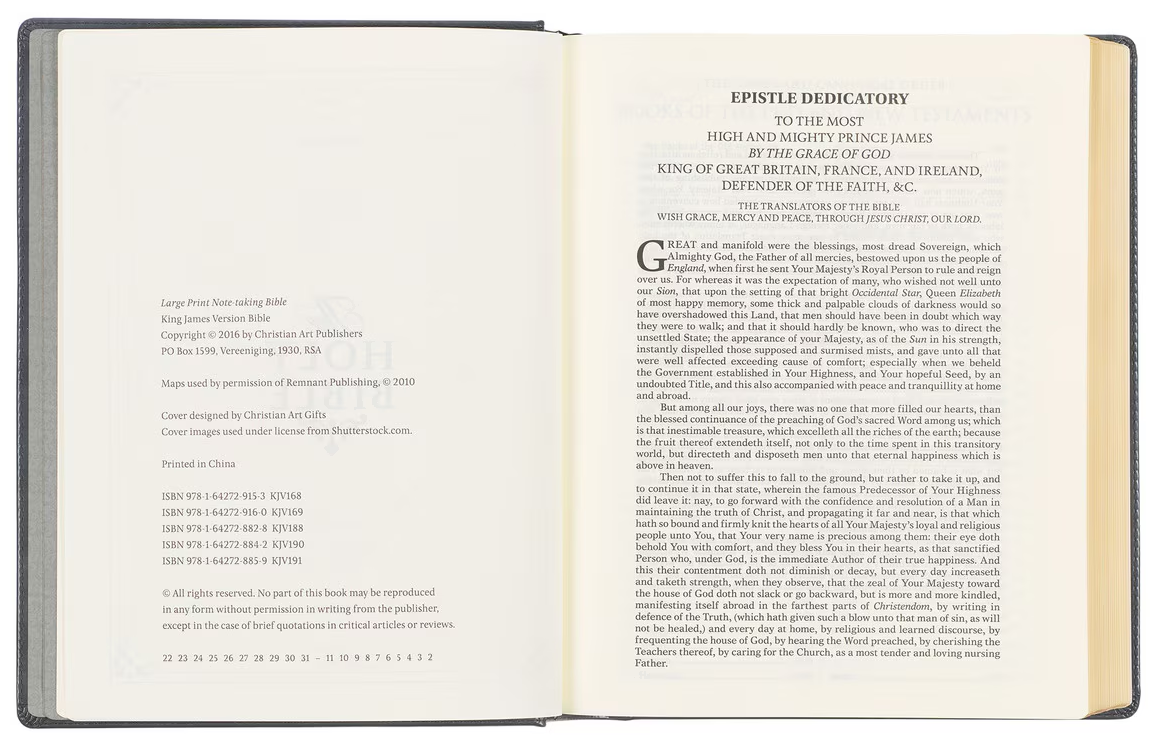 To cater to your individual study needs, several pages are included at the back of the Bible for you to add your own notes. In addition, the Epistle Dedicatory letter is included in the front for historical context and reference. Immerse yourself in the original 1769 English text as you delve into the Word. It faithfully presents the language and spelling of the era, offering a glimpse into the historical roots of the King James Version. While reading, anticipate encountering subtle variations in spelling and language usage that differ from modern English. Embrace these differences as they add authenticity and contribute to a richer understanding of the scriptures.