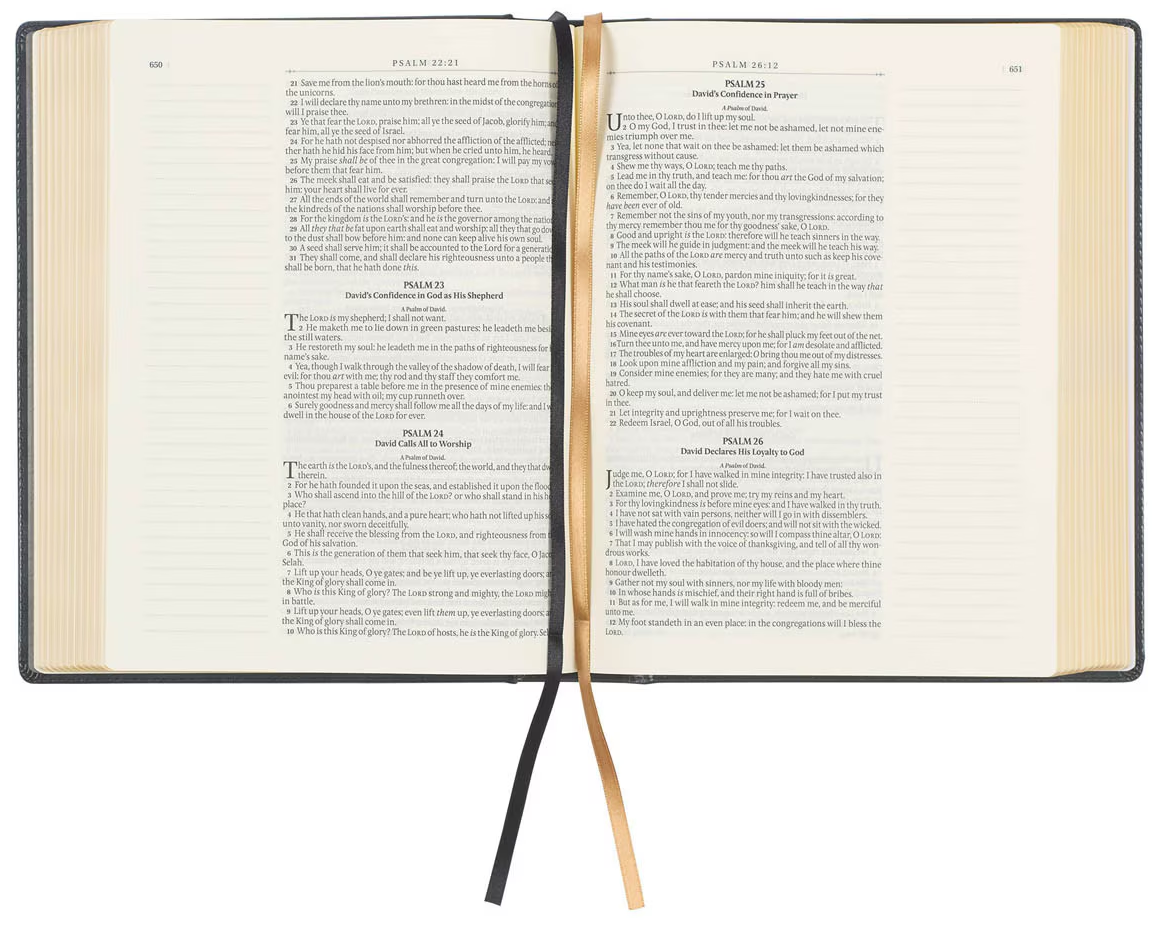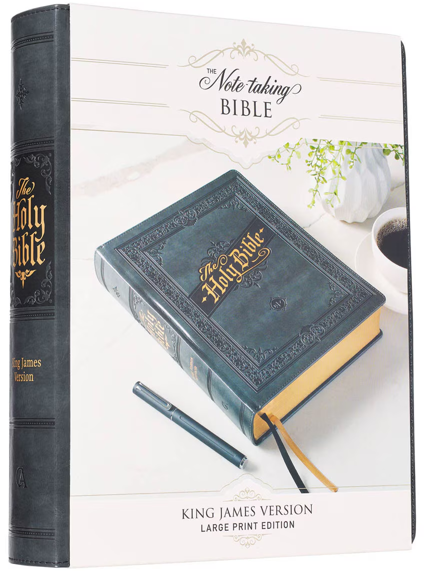 Enhance your Bible study experience with the Iron Gray Faux Leather Hardcover Large Print King James Version Note-taking Bible. Its large print text ensures effortless reading, allowing you to dive deep into the scriptures. As you listen to sermons, take advantage of the Bible's wide margins to jot down insightful notes and reflections.