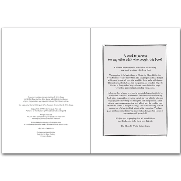 The popular little book Steps to Christ by Ellen White has been translated into more than 165 languages and has helped millions of people all over the world in their walk with Jesus. This coloring book, based on the principles found in Steps to Christ, is designed to help children take their first steps towards a personal relationship with Jesus.
