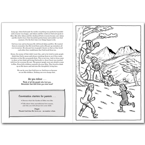 Coloring has always provided a wonderful opportunity to be expressive as well as meditative. This interactive coloring book aims to provide a creative outlet for your child while also engaging and directing the thoughts and imagination. Each picture has an accompanying text which may be read to your child if he or she is not yet reading. This is followed by a short suggested activity to do while coloring. Finally, each picture is accompanied by a prayer suggestion and some conversation starters to help you and your child learn more together.
